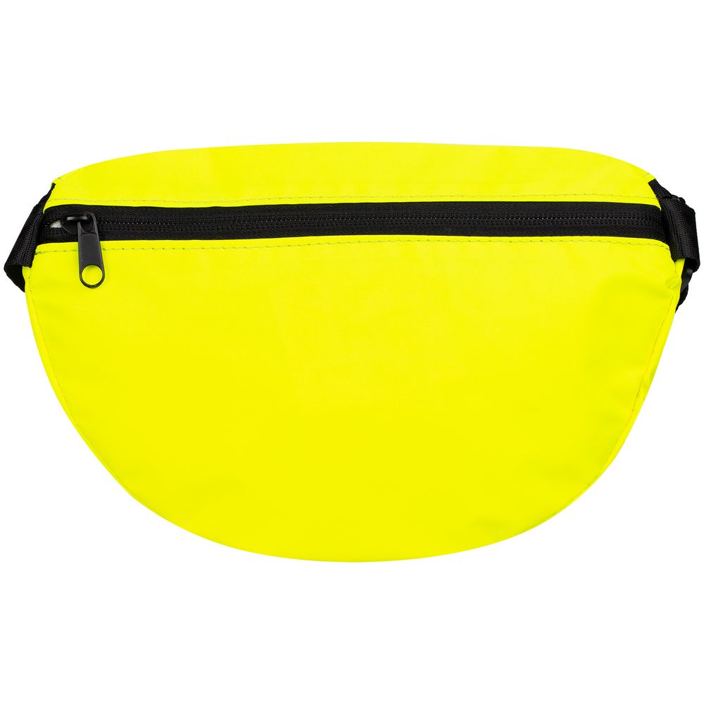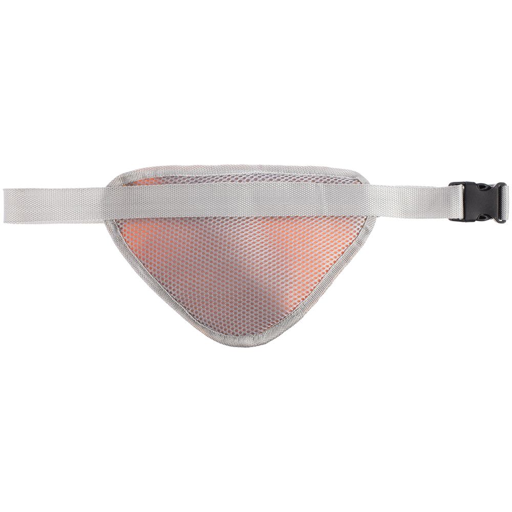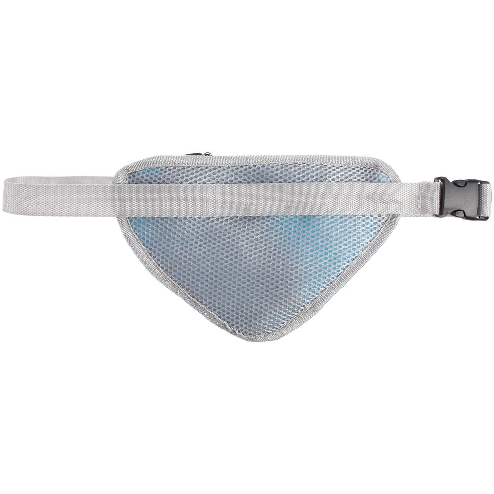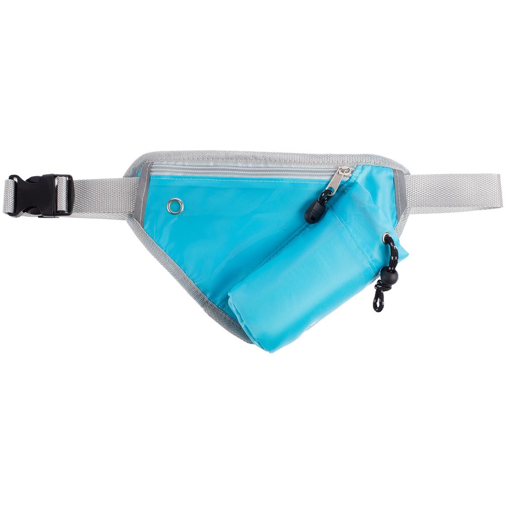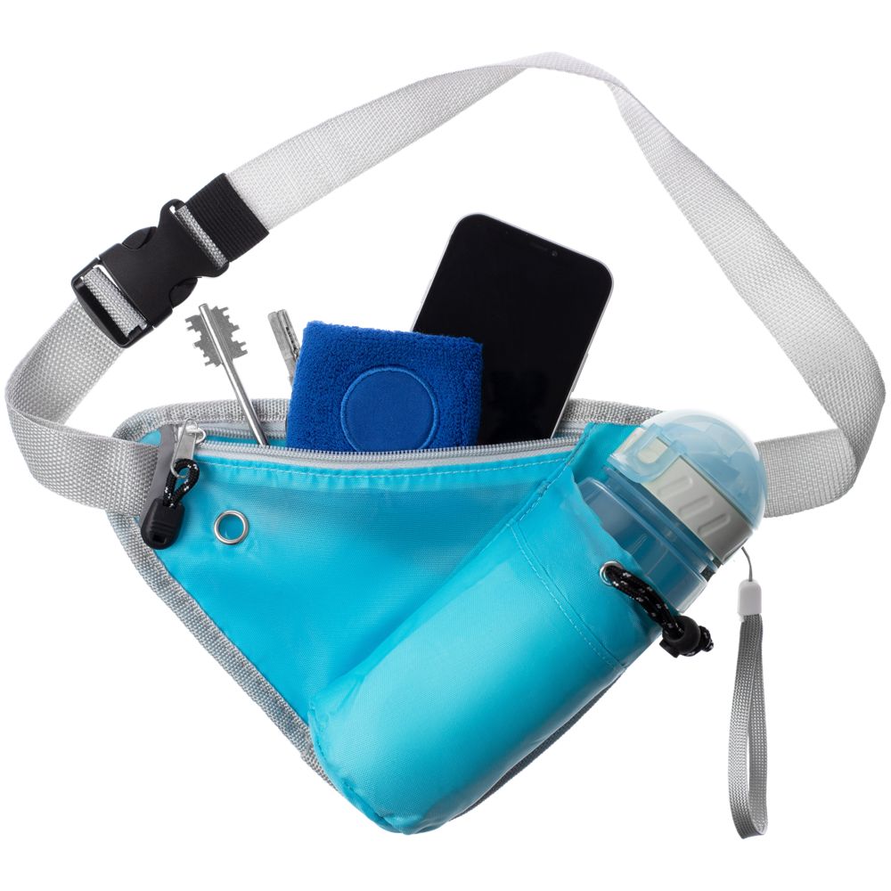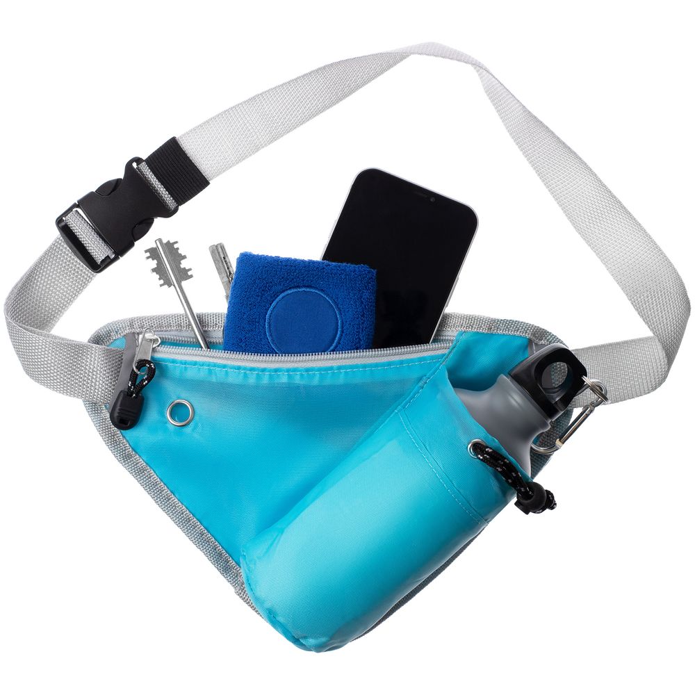 Сумка имеет внешний карман на молнии для хранения телефона и полезных мелочей и отделение со шнуром-фиксатором под бутылку для воды диаметром до 7 см. Ремень выполнен из прочной регулируемой стропы. Светоотражающие детали помогут оставаться заметными во время тренировок в сумерках и темноте.